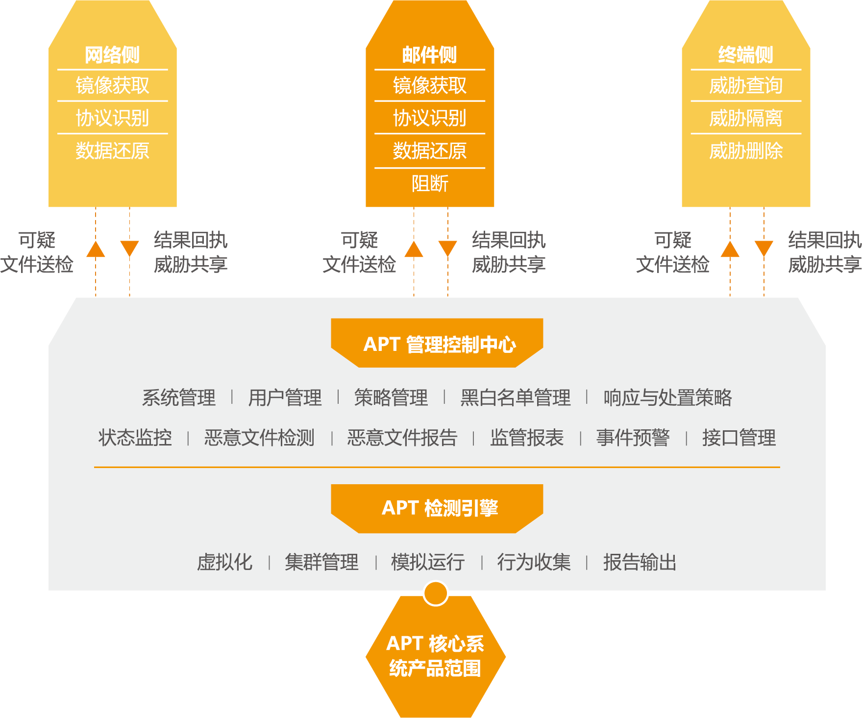 APT檢測防御解決方案利用基于虛擬沙盒的動態(tài)檢測技術(shù),可以檢測未知的漏洞及威脅攻擊。引入沙箱技術(shù)來模擬真實的硬件、操作系統(tǒng)及應(yīng)用軟件環(huán)境來檢測未知的惡意文件攻擊行為,能夠有效應(yīng)對從網(wǎng)絡(luò)端、郵件端、辦公終端而來的 APT 攻擊。