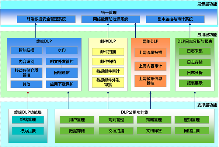 數(shù)據(jù)防泄漏平臺架構(gòu)包含展示層功能、應(yīng)用層功能及支撐層三層架構(gòu)。其中: