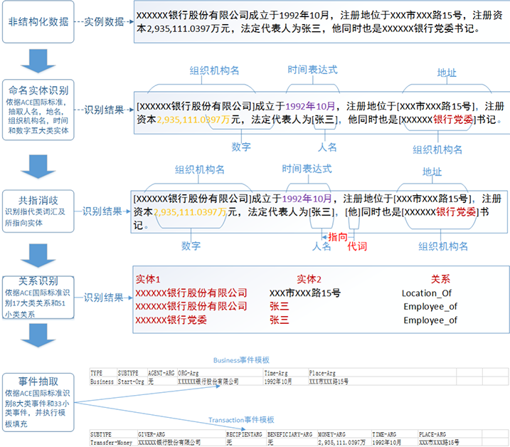 面向非結構化數(shù)據(jù)的知識抽取使用信息抽取技術解決,信息抽取包括命名實體識別、關系識別、共指消歧、事件抽取及模板填充五個任務,其流程如下圖所示: