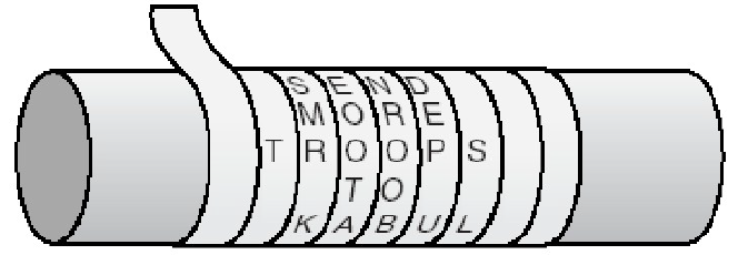 公元前404年,斯巴達(dá)國(guó)(今希臘)北路軍司令萊山得在征服雅典之后,本國(guó)的信使趕到,獻(xiàn)上了一條皮帶,上面有文字,通報(bào)了敵將斷其歸路的企圖。萊山得當(dāng)機(jī)立斷,率師輕裝脫離了險(xiǎn)境。