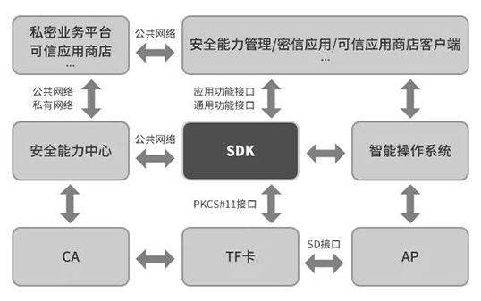 應用功能API接口接口將加密TF卡基礎功能和與安全能力中心交互功能進行組合,為密信、可信應用商店提供所需的功能接口,可向所有安全應用開發(fā)者開放使用;