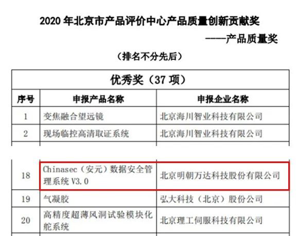 近日,由北京市產(chǎn)品評(píng)價(jià)中心主辦的“2020年產(chǎn)品質(zhì)量創(chuàng)新貢獻(xiàn)獎(jiǎng)”評(píng)選結(jié)束,并正式公布“產(chǎn)品質(zhì)量創(chuàng)新成果表彰名單”。其中,明朝萬(wàn)達(dá)北京科技股份有限公司(明朝萬(wàn)達(dá))憑借自主研發(fā)創(chuàng)新產(chǎn)品“Chinasec(安元)數(shù)據(jù)安全管理系統(tǒng)V3.0”榮獲“產(chǎn)品質(zhì)量?jī)?yōu)秀獎(jiǎng)”。