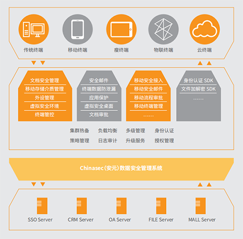 Chinasec(安元)數(shù)據(jù)安全管理系統(tǒng)以“防內(nèi)為主、內(nèi)外兼防”為理念,通過認證、加密、監(jiān)控、追蹤等手段,對傳統(tǒng) PC 終端和移動終端提供文檔加密、身份認證、安全接入、應用保護、訪問控制等全方面的安全防護。采用 C/S 架構(gòu)和 B/S 架構(gòu)相結(jié)合,內(nèi)外網(wǎng)互通的架構(gòu)思路,對網(wǎng)絡(luò)安全和數(shù)據(jù)安全提供全 IT 架構(gòu)的多套解決方案,針對敏感數(shù)據(jù)提供全生命周期的安全管理和審計。將安全防護貫穿于數(shù)據(jù)產(chǎn)生、訪問、傳輸、使用和銷毀的過程中,真正實現(xiàn)事前安全管理、事后行為審計。