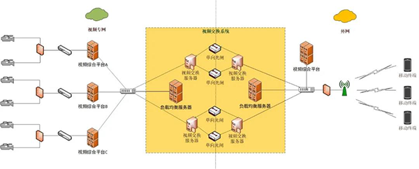 針對需要高性能的場景,本系統(tǒng)實現(xiàn)了負載均衡功能。在需要支持更高的性能需求的情況下,可以在外網(wǎng)和視頻專網(wǎng)各增加一臺視頻交換負載服務(wù)器,并在外網(wǎng)和視頻專網(wǎng)邊界增加多套視頻交換系統(tǒng)以滿足更高性能。