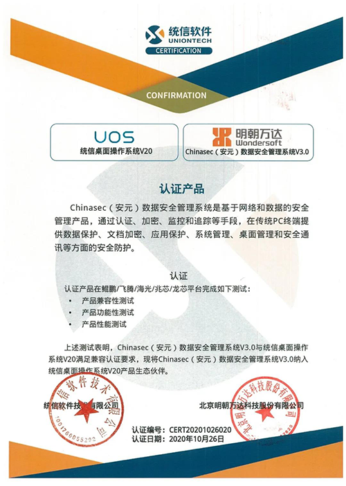 Chinasec(安元)數(shù)據(jù)安全管理系統(tǒng)V3.0與統(tǒng)信服務(wù)器操作系統(tǒng)V20兼容認(rèn)證證書