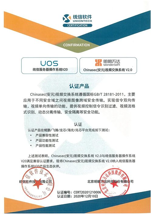 Chinasec(安元)視頻交換系統(tǒng)V2.0與統(tǒng)信服務(wù)器操作系統(tǒng)V20兼容認(rèn)證證書