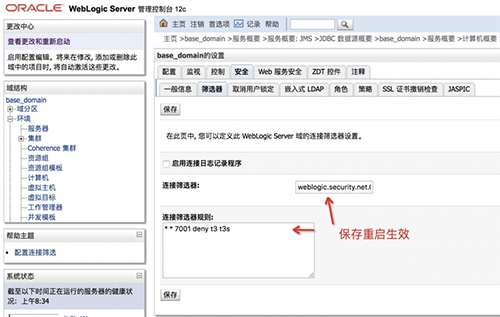 2. 在連接篩選器中輸入:weblogic.security.net.ConnectionFilterImpl,在連接篩選器規(guī)則框中輸入:* * 7001 deny t3 t3s。