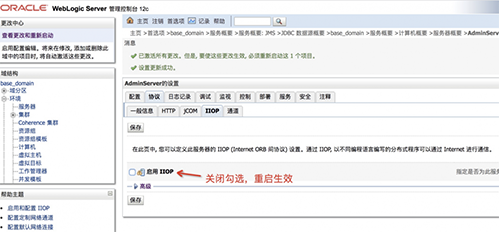 登陸Weblogic控制臺(tái),找到啟用IIOP選項(xiàng),取消勾選,重啟生效