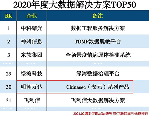 近日,由《互聯(lián)網(wǎng)周刊》、德本咨詢、eNet研究院聯(lián)合發(fā)布的《2020年度大數(shù)據(jù)解決方案TOP50》榜單正式公布,明朝萬達憑借卓越的技術創(chuàng)新能力以及在大數(shù)據(jù)安全領域突出表現(xiàn)成功入選。