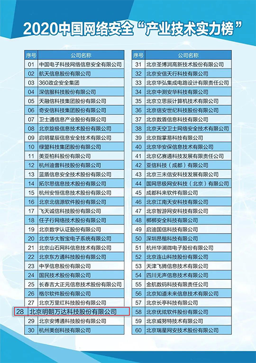 近期,由信息安全與通信保密雜志社聯(lián)合有關(guān)企事業(yè)單位,共同研究編寫的《2020中國(guó)網(wǎng)絡(luò)空間安全產(chǎn)業(yè)發(fā)展綜述報(bào)告》公布。北京明朝萬(wàn)達(dá)科技股份有限公司(以下簡(jiǎn)稱“明朝萬(wàn)達(dá)”)憑借突出的技術(shù)創(chuàng)新力和卓越的品牌影響力,榮登中國(guó)網(wǎng)絡(luò)安全“產(chǎn)業(yè)技術(shù)實(shí)力榜”。