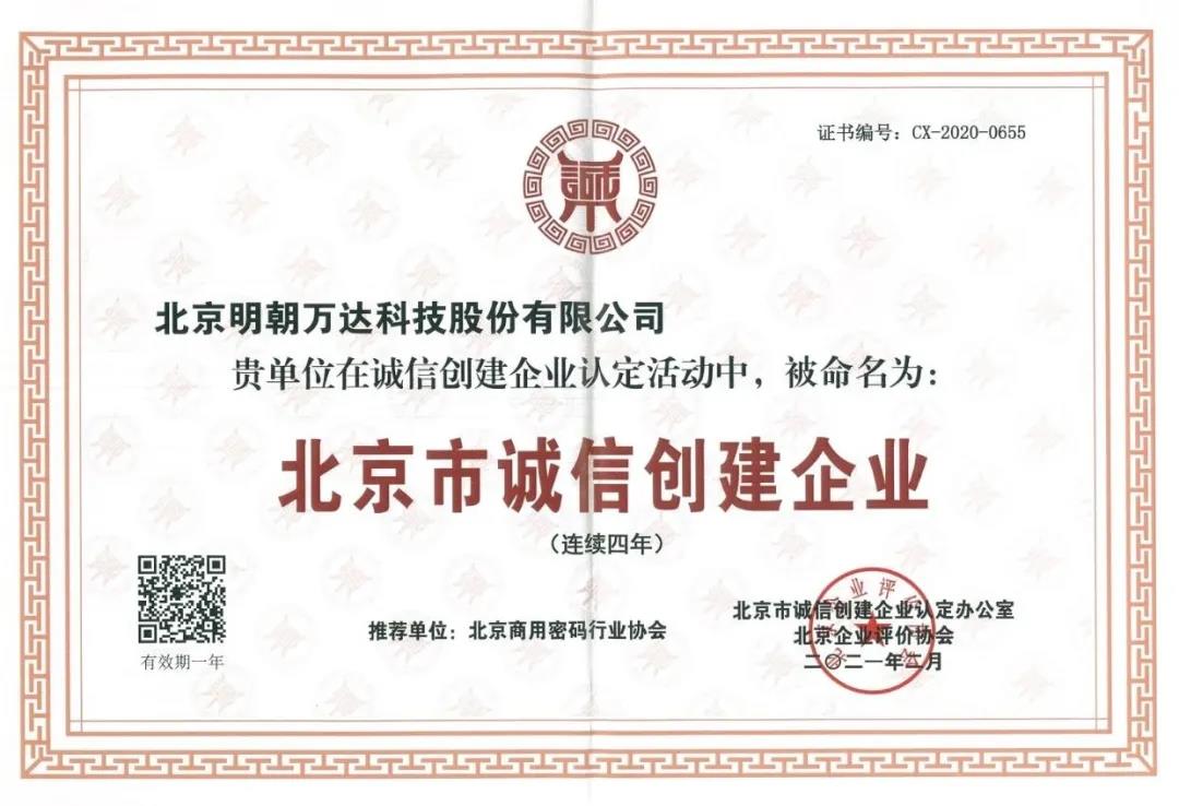 連續(xù)四年獲評“北京市誠信創(chuàng)建企業(yè)”稱號,充分體現(xiàn)了政府、行業(yè)、協(xié)會對明朝萬達誠信經(jīng)營、守法經(jīng)營良好形象的認可,也體現(xiàn)了業(yè)界對明朝萬達十余年深耕數(shù)據(jù)安全領域所作努力的肯定。未來,明朝萬達將繼續(xù)保持優(yōu)良作風,積極承擔企業(yè)社會責任,為營造守法經(jīng)營、誠實守信的社會氛圍做出企業(yè)應有的貢獻。