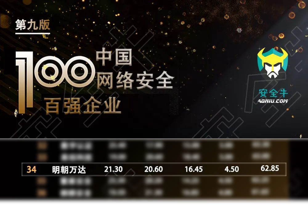 今日,國內(nèi)權(quán)威安全媒體“安全?!卑l(fā)布了《中國網(wǎng)絡(luò)安全企業(yè)100強》(第九版)。明朝萬達(dá)憑借在數(shù)據(jù)安全領(lǐng)域的卓越表現(xiàn)入選中國網(wǎng)絡(luò)安全企業(yè)100強。