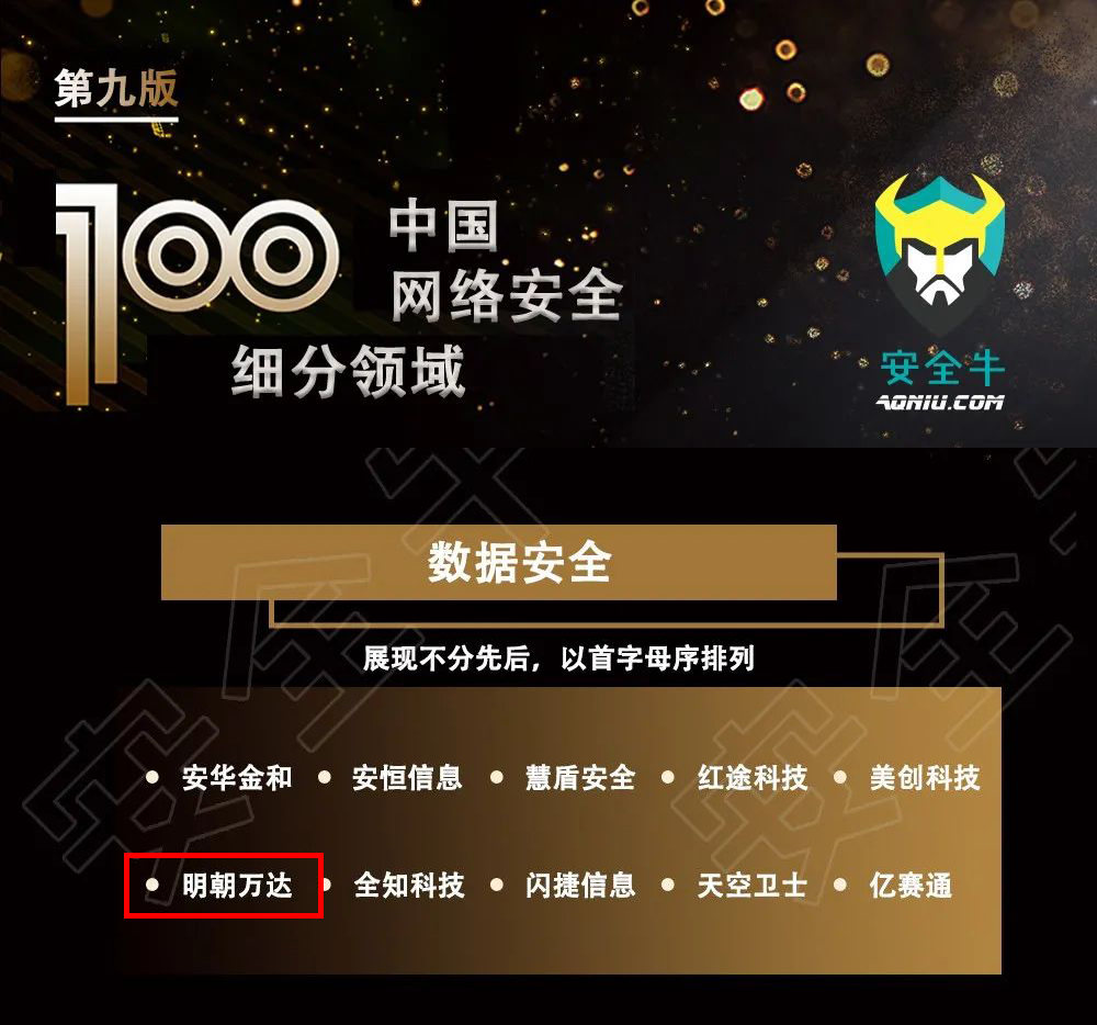 此次發(fā)布的《中國網(wǎng)絡(luò)安全企業(yè)100強》是安全牛百強報告的第九版,從營收占比、用戶數(shù)量、產(chǎn)品成熟度等角度,對細(xì)分領(lǐng)域中有較突出表現(xiàn)的企業(yè)進(jìn)行了收錄,明朝萬達(dá)作為數(shù)據(jù)安全細(xì)分領(lǐng)域的領(lǐng)先企業(yè)位列其上。