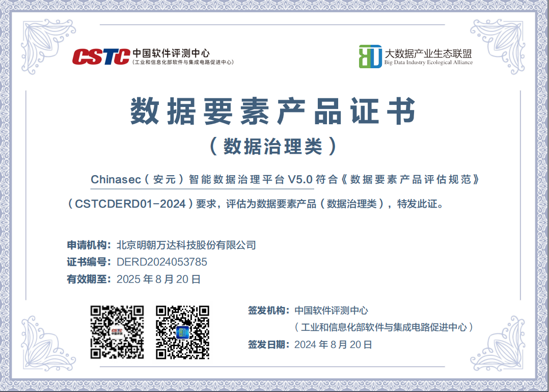 為樹立數(shù)據(jù)要素應(yīng)用的行業(yè)標(biāo)桿,加快數(shù)據(jù)要素賦能千行百業(yè)的步伐,會上,由中國計算機行業(yè)協(xié)會大數(shù)據(jù)產(chǎn)業(yè)生態(tài)專委會組織、中國軟件評測中心專業(yè)執(zhí)行的“數(shù)據(jù)要素優(yōu)秀產(chǎn)品、解決方案與案例測評”結(jié)果正式公布。明朝萬達(dá)Chinasec(安元)數(shù)據(jù)安全合規(guī)檢查工具V5.0 、Chinasec(安元)數(shù)據(jù)防泄漏系統(tǒng)V5.0、Chinasec(安元)智能數(shù)據(jù)治理平臺V5.0三款產(chǎn)品通過測評,榮獲“數(shù)據(jù)要素產(chǎn)品證書”。