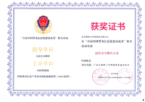 為進一步加強警務信息化建設,更好地解決各地公安機關在工作中面臨的實際問題,推進“互聯(lián)網+”時代下警務信息化的融合發(fā)展,“首屆中國警務信息化建設成果”推介活動共征集到來自全國128家公安機關和企事業(yè)單位報送的近200項方案。明朝萬達“廣西公安新一代移動警務建設項目”成功入圍,并最終榮獲“最佳安全解決方案”獎。