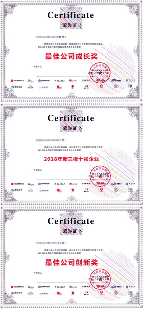 在第二屆中國新三板年度風云榜發(fā)布及頒獎儀式上,明朝萬達憑借在新三板的優(yōu)勢表現,榮獲“新三板十強企業(yè)”、“新三板最佳公司成長獎”、“新三板最佳公司創(chuàng)新獎”三項殊榮。此次評選是以華財新三板投資者保護指數、財務指標等作為基本入圍條件,并通過專家打分和網絡投票的形式評選得出。此次獲獎,彰顯了明朝萬達的行業(yè)地位,以及市場的認可與肯定,充分體現了明朝萬達的行業(yè)發(fā)展?jié)摿巴顿Y價值。