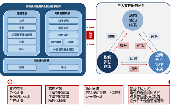 首先通過感知體系發(fā)現(xiàn)的需要重點保護的數(shù)據(jù),數(shù)據(jù)發(fā)現(xiàn)方法是通過文檔摘要、語言分析、文檔向量化等方式,將半結構化及非結構化文檔,轉換為結構化形式,并標識其主要特點形成標簽,以JSON格式存儲在第三方數(shù)據(jù)庫,與被標簽化的主體,通過標簽ID進行關聯(lián)。接下來圍繞數(shù)據(jù)生命周期進行數(shù)據(jù)安全分析和管控,在產(chǎn)生、使用環(huán)節(jié),進行訪問權限控制;在傳輸、存儲環(huán)節(jié),進行數(shù)據(jù)加密控制;在銷毀環(huán)節(jié),確保數(shù)據(jù)被真實銷毀。最后以企業(yè)的數(shù)據(jù)化能力指數(shù)為基礎,設計數(shù)據(jù)安全指數(shù)體系,力求完整、全面、客觀地對數(shù)據(jù)安全狀態(tài)進行評估。形成完整的數(shù)據(jù)安全管控體系。通過對重要數(shù)據(jù)全生命周期的感知、分析、評估,形成體系化管控模式,確保重要業(yè)務數(shù)據(jù)安全可見、可管、可控。