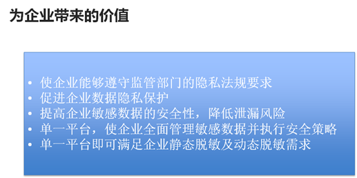 它具有靜態(tài)和動(dòng)態(tài)數(shù)據(jù)隱私功能,這些功能從一個(gè)集成數(shù)據(jù)管理平臺(tái)上執(zhí)行,包括隱私數(shù)據(jù)發(fā)現(xiàn)、抽取、隱私數(shù)據(jù)漂白、測(cè)試數(shù)據(jù)管理、數(shù)據(jù)裝載、數(shù)據(jù)銷毀、權(quán)限管理、性能監(jiān)控等功能于一體,并更好地保障了數(shù)據(jù)的安全性。