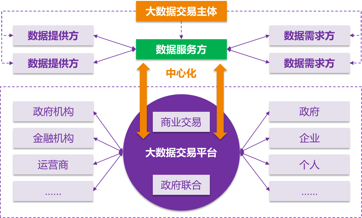國內(nèi)大數(shù)據(jù)交易平臺(tái)主要可以分為兩類:一類是以數(shù)據(jù)生產(chǎn)或數(shù)據(jù)服務(wù)類企業(yè)為主導(dǎo)、商業(yè)職能為主的大數(shù)據(jù)交易平臺(tái),另一類是政府聯(lián)合其他主體投資、合作的大數(shù)據(jù)交易平臺(tái)。大數(shù)據(jù)交易平臺(tái)大多采用中心化系統(tǒng)結(jié)構(gòu),大數(shù)據(jù)交易主體包括數(shù)據(jù)提供方、數(shù)據(jù)服務(wù)方、數(shù)據(jù)需求方,數(shù)據(jù)提供方很少直接面對(duì)數(shù)據(jù)需求方,數(shù)據(jù)服務(wù)方在整個(gè)大數(shù)據(jù)流通和交易過程中,中心支配地位突出。