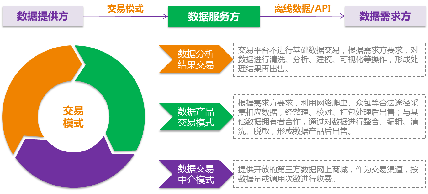 大數(shù)據(jù)交易平臺(tái)采用數(shù)據(jù)分析結(jié)果交易、數(shù)據(jù)產(chǎn)品交易和數(shù)據(jù)交易中介等三種交易模式,最終數(shù)據(jù)服務(wù)方采用離線數(shù)據(jù)或API等方式將交易數(shù)據(jù)提供給數(shù)據(jù)需求方。