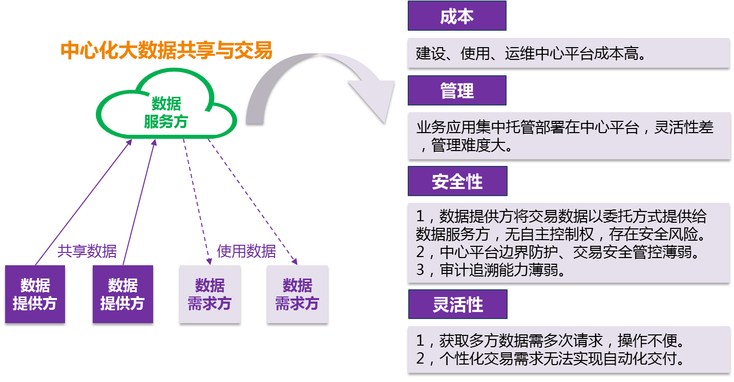 國內(nèi)大數(shù)據(jù)交易處于初期階段,部分大數(shù)據(jù)交易平臺(tái)制定了大數(shù)據(jù)交易規(guī)則,對(duì)交易平臺(tái)、交易主體、交易對(duì)象進(jìn)行規(guī)范,屬于探索性質(zhì)。針對(duì)大數(shù)據(jù)交易共性敏感問題,缺乏全面、權(quán)威、有公信力的解決方案。在中心化系統(tǒng)結(jié)構(gòu)下,大數(shù)據(jù)交易存在成本、管理、安全性、靈活性等方面的問題難以突破,對(duì)大數(shù)據(jù)安全共享與交易形成了挑戰(zhàn)。