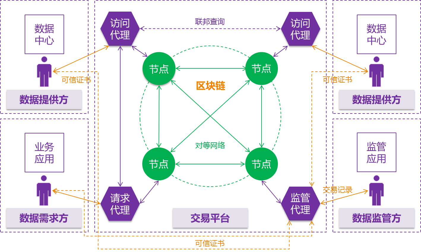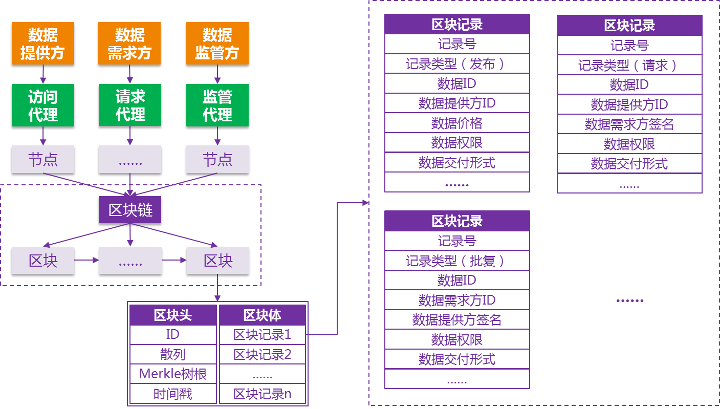 數(shù)據(jù)供需雙方依托區(qū)塊鏈基礎(chǔ)設(shè)施,憑借數(shù)據(jù)監(jiān)管方頒發(fā)的可信證書加入大數(shù)據(jù)共享與交易聯(lián)盟網(wǎng)絡(luò)。數(shù)據(jù)提供方發(fā)布數(shù)據(jù)描述信息到區(qū)塊鏈。數(shù)據(jù)需求方從區(qū)塊鏈獲取數(shù)據(jù)提供方發(fā)布的數(shù)據(jù)描述信息,選擇目標(biāo)數(shù)據(jù),發(fā)布數(shù)據(jù)權(quán)限請(qǐng)求到區(qū)塊鏈。數(shù)據(jù)提供方從區(qū)塊鏈獲取數(shù)據(jù)需求方發(fā)布的數(shù)據(jù)權(quán)限請(qǐng)求,按照特定規(guī)則進(jìn)行權(quán)限批復(fù),將權(quán)限批復(fù)結(jié)果發(fā)布到區(qū)塊鏈。數(shù)據(jù)需求方的數(shù)據(jù)訪問請(qǐng)求經(jīng)請(qǐng)求代理發(fā)送到數(shù)據(jù)提供方的訪問代理,如果認(rèn)證通過,則可以訪問大數(shù)據(jù)中心數(shù)據(jù)。數(shù)據(jù)監(jiān)管方作為區(qū)塊鏈節(jié)點(diǎn)加入網(wǎng)絡(luò),同步區(qū)塊鏈所有數(shù)據(jù)塊,對(duì)大數(shù)據(jù)共享與交易進(jìn)行監(jiān)管。