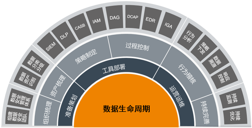 數(shù)據(jù)安全治理并非僅由單一產(chǎn)品或平臺(tái)所構(gòu)建,而是圍繞數(shù)據(jù)生命周期,結(jié)合企業(yè)或組織自身數(shù)據(jù)現(xiàn)狀,建立與制度流程配套的技術(shù)和工具,持續(xù)提升企業(yè)或組織的數(shù)據(jù)安全防護(hù)能力,如下圖所示: