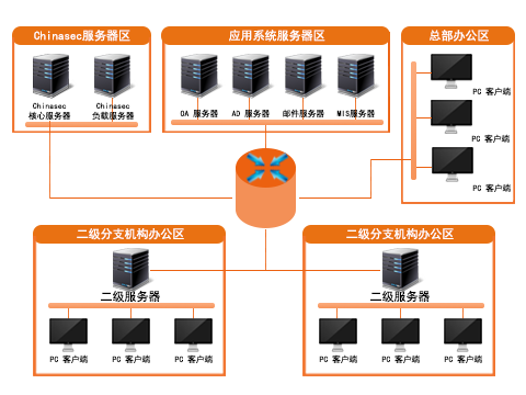 - 2臺二級服務(wù)器部署在北京中心二級分中心,負責(zé)分公司辦公終端管理;