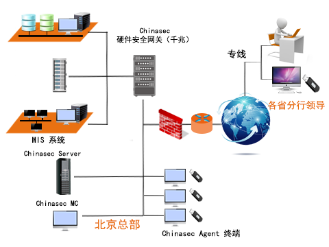 基于該需求,明朝萬(wàn)達(dá)項(xiàng)目組深入了解了中行業(yè)務(wù)流程,確定如下項(xiàng)目實(shí)施框架,以 Chinasec(安元)平臺(tái)的“終端認(rèn)證”和“安全網(wǎng)關(guān)”系統(tǒng)為基礎(chǔ),通過(guò)“軟件客戶端+硬件Usbiey+硬件網(wǎng)關(guān)”的方式加固MIS服務(wù)器安全、登錄訪問(wèn)安全、通訊鏈路安全和訪問(wèn)終端安全。
