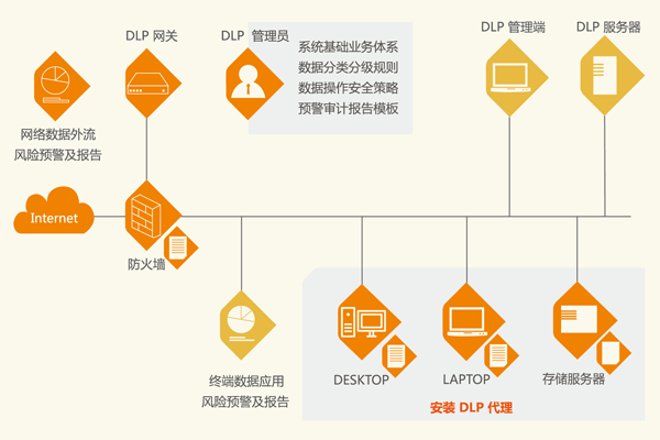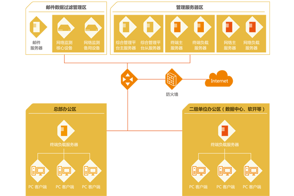 ? ? ? 為實(shí)現(xiàn)集中統(tǒng)一化的管理,終端數(shù)據(jù)防泄漏系統(tǒng)分別部署一臺(tái)主服務(wù)器、一臺(tái)熱備服務(wù)器及多臺(tái)負(fù)載服務(wù)器,網(wǎng)絡(luò)數(shù)據(jù)防泄漏系統(tǒng)和綜合管理平臺(tái)分別部署一臺(tái)主服務(wù)器、一臺(tái)熱備服務(wù)器,組成數(shù)據(jù)防泄漏系統(tǒng)的服務(wù)器區(qū)域,確保冗余和高可用性。由綜合管理平臺(tái)統(tǒng)一提供多級(jí)管理模式,實(shí)現(xiàn)對(duì)各分行的分級(jí)管理。