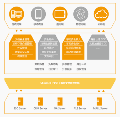 ? ? ? Chinasec(安元)數(shù)據(jù)安全管理系統(tǒng),以“防內(nèi)為主、內(nèi)外兼防”為理念,通過認證、加密、監(jiān)控、追蹤等手段,對傳統(tǒng) PC 終端和移動終端提供文檔加密、身份認證、安全接入、應(yīng)用保護、訪問控制等全方位的安全防護。
