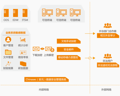 ? ? ? 采用 Chinasec(安元)數(shù)據(jù)安全管理系統(tǒng),提供數(shù)據(jù)全生命周期防護解決方案,員工從業(yè)務(wù)系統(tǒng)下載的敏感文檔在企業(yè)內(nèi)部以密文的形式流轉(zhuǎn),終端邊界管控策略則保證了非法途徑無法獲取、無法解密敏感文檔。