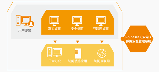 ? ? ? 采用 Chinasec(安元)數(shù)據(jù)安全管理系統(tǒng)虛擬安全桌面(VSP)整體解決方案。工作終端分為真實桌面、安全桌面、互聯(lián)網(wǎng)三個桌面根據(jù)策略配置,可實現(xiàn)數(shù)據(jù)隔離、網(wǎng)絡(luò)隔離、設(shè)備隔離,在不影響正常辦公的同時,防止企業(yè)敏感數(shù)據(jù)泄漏。