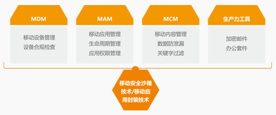 ? ? ? 由于使用 BYOD 設(shè)備,鑒于應(yīng)用開(kāi)發(fā)商產(chǎn)品的標(biāo)準(zhǔn)性以及設(shè)備的差異性,僅靠移動(dòng)辦公應(yīng)用自身,很難在保障用戶(hù)體驗(yàn)一致的情況下,實(shí)現(xiàn)移動(dòng)辦公用戶(hù)與個(gè)人應(yīng)用及數(shù)據(jù)的隔離,故為企業(yè)提供一套移動(dòng)安全平臺(tái),在移動(dòng)設(shè)備與移動(dòng)應(yīng)用之間,解決差異性和安全性的問(wèn)題。